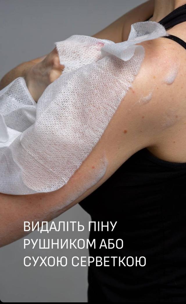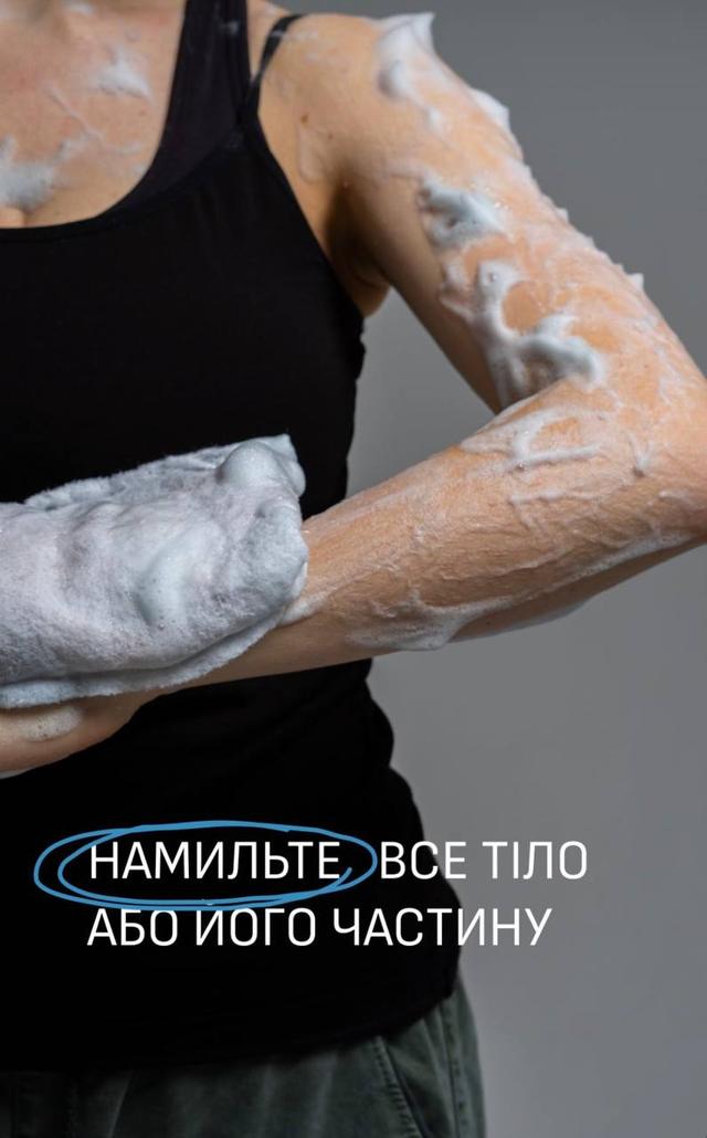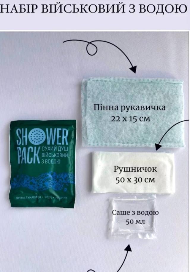 В упаковці 1 пінна рукавиця + вода + рушник, що дозволяє помити все тіло та витертись.